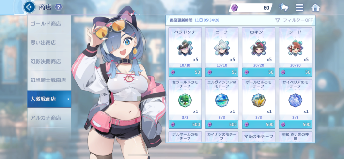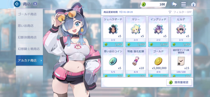 アルカナ商店では、アルカナコインを消費してアイテムを購入可能です。シェヘラザード、マリー、イングリッド、ヒルデの絆の記録、思い出のコイン、強化素材などを購入でき、ラインナップは毎月更新されます。