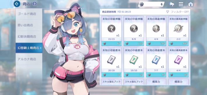 幻想騎士戦商店では、幻想騎士戦コインを消費してアイテムを購入可能です。キャラのスキル強化や勇者の力に必要な素材を購入でき、ラインナップは毎月更新されます。
