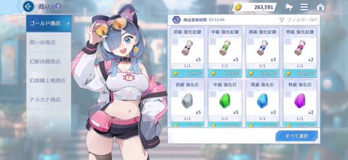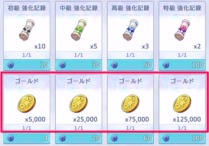 ゴールド商店では、ゴールドを消費してアイテムを購入可能です。強化記録、強化石、スキル強化ブック、構想力を購入でき、ラインナップは毎日0時に更新されます。