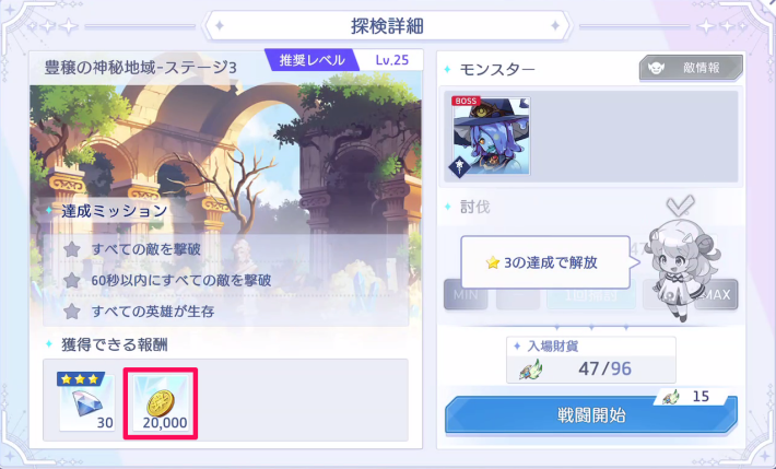 ゴールドは、主に遺跡探査の豊穣の神秘地域やミッションで獲得できます。ゴールド商店以外にもキャラの強化、勇者の力の強化、王城のランクアップなど使用用途が多いため、商店での使いすぎには注意しましょう。