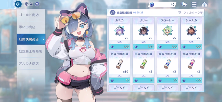 幻影決闘商店では、幻影決闘コインを消費してアイテムを購入可能です。カミラ、リリー、フローリー、シャルカの絆の記録、強化記録、ゴールドを購入でき、ラインナップは毎日0時に更新されます。