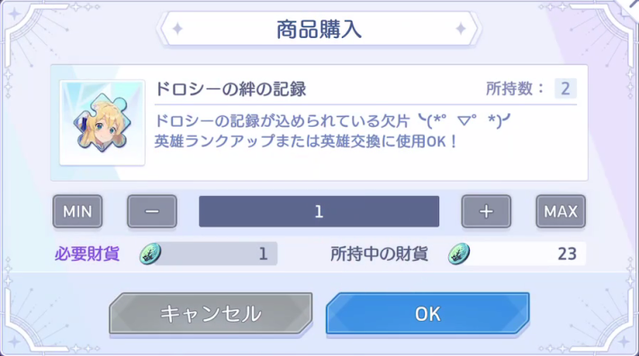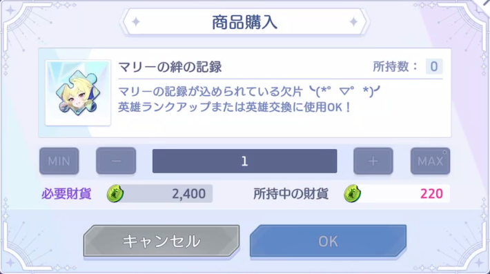 思い出商店では、思い出コインを消費して自分が所持している英雄(キャラ)の絆の記録を購入可能です。絆の記録は同じアイテムを20個購入するごとに価格が上昇し、最大で1つにつき5コイン必要となります。