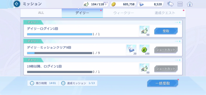 バトルパスは、ミッションのデイリー、ウィークリーを完了することで進めることができます。ミッションを1つ完了するたびに1ポイント獲得でき、ポイントが溜まるとパスレベルが上がり報酬を獲得できます。