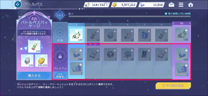 課金してプレミアムパス/バトルパスパッケージを購入すると、プレミアム報酬を追加で獲得可能になります。無償の報酬にくわえて多くの育成素材やバトルパスに応じた豪華な報酬を獲得することができます。