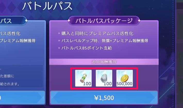 育成を素早く進めたい人は、特におすすめです。バトルパスパッケージではプレミアムパスと同じ内容にくわえ、中級 強化記録×100、初級 強化石×100、ゴールド×500,000を獲得できるため、大きく育成を進める助けになります。