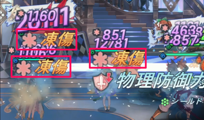 メインでは凍傷&攻撃速度ダウン、リンクでも凍傷を与えてきます。凍傷が付与されたキャラは毎秒ダメージを受けてしまい移動速度と攻撃速度が下がってしまうため、攻撃回数で発動するサブスキルは回転率が大きく落ちてしまいます。
