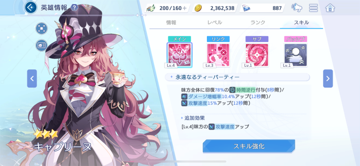 サブ | 通常攻撃時、20%の確率で敵1体に魔法攻撃力の300%のダメージ 自分にSP回復率25%アップ(10秒間) |