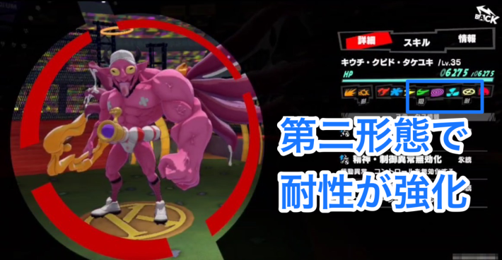 シャドウ木内の体力を削り切ると、第二形態「キウチ・クピド・タケユキ」になります。第二形態からは疾風属性スキルを使うようになり、さらに祝福属性スキルの耐性が追加されます。
