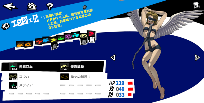 エンジェル | ・HPと属性異常を回復するヒーラー └シャドウ木内戦では風襲を治せる ・単体と全体の両方を回復できる ・調伏の領域で入手可能 |