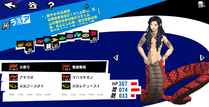 ワンダーをアタッカーとして使う場合、ザコ敵の弱点を突ける火炎か核熱スキルを持ったペルソナがおすすめです。特にラミアは火炎スキルと炎上で十分なダメージを出せるので、所持していれば主力として使いましょう。