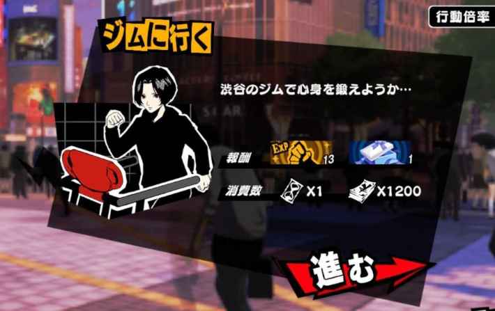 ペルソナ5Xのジムは、1回行うごとに1個の行動力を使用します。行動力が0の時はジムに行けないため、時間経過で回復させるか「ムゲンワーク」を使って回復させましょう。