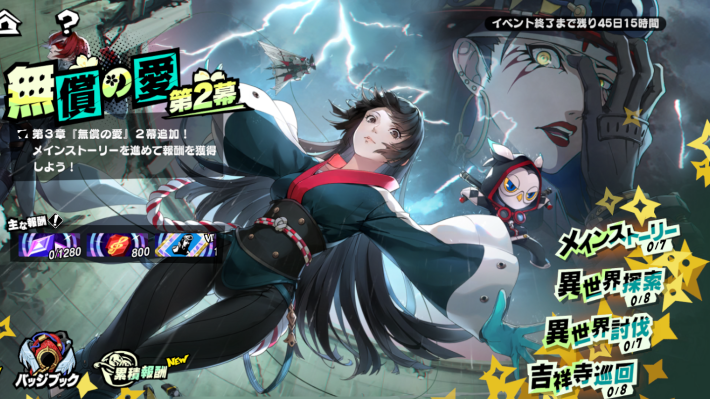 『無償の愛』第2幕の公開記念イベントです。「メインストーリー」「異世界探索」「異世界討伐」「吉祥寺巡回」の各目標をクリアすると、各種報酬やイベントアイテム「梅花の腕章」を獲得できます。