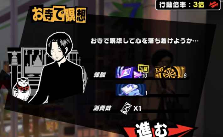 映画はコストとして行動力1と所持金1200を消費しますが、渋谷、新宿、四軒茶屋の3か所があり都市行動に出現する確率が高いです。映画によって上がるパラメータは違いますが、器用さを上げたい場合は1つの選択肢になります。