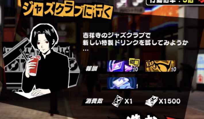 ジャズクラブでは行動力1と所持金1500を消費しますが1回で優しさが10上昇します。ただ、ジャズクラブは都市行動に出現時、器用さ以外のパラメータがランダムに選択されるので、必ずしも優しさを上げられるわけではない点に注意しましょう。