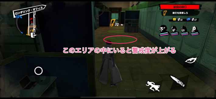 警戒度を上げないよう、サーチライトに気をつけながら進みましょう。サーチライトの範囲内にいると警戒度が上がり、100%になると強制終了になります。