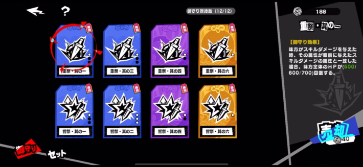 重祭と響祭のセット効果による弱点の追加や被ダメージの増加と「星刻」のダメージをあげて高速周回を狙う、育成が進んでいたり戦闘に余裕があるプレイヤー向けなお守りセットです。耐久を上げたい場合は、治癒や加護を入れましょう。