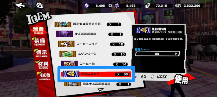 怪盗の認知片はメニューにある「カバン」の消費の項目内にあり、先に使用する個数を指定して使うシステムになっています。