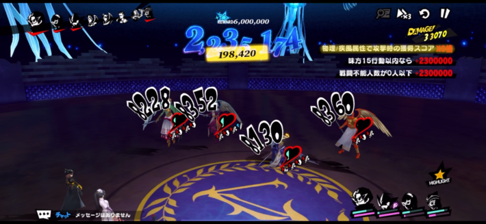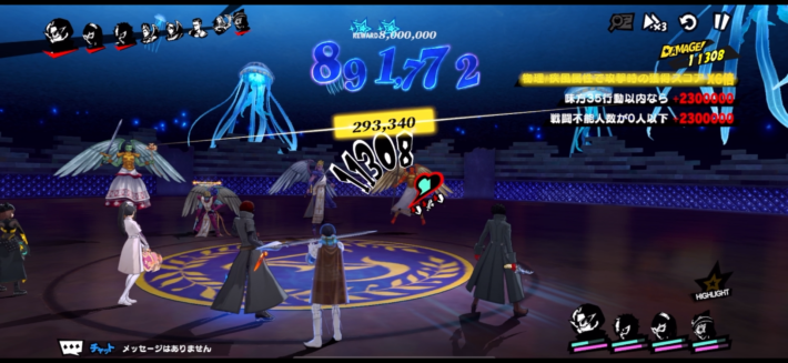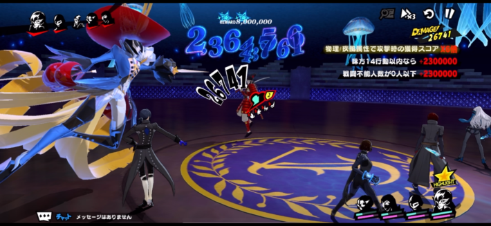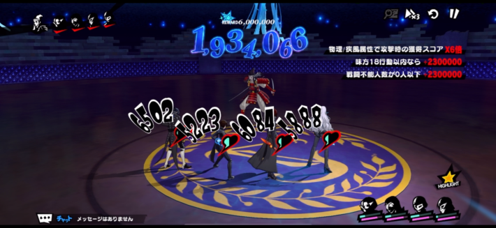 | ・物理/疾風属性で攻撃時の獲得スコアが6倍 ・味方の行動が40行動以内ならスコアに+2,300,000 ・戦闘不能人数が0人以下でスコアに+2,300,000 |