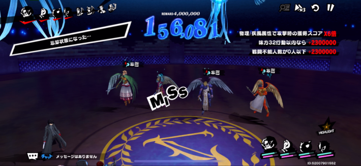 | 特徴 | ・敵4体は弱点を持たない ・クリティカルとウィンドでダウン値を減少 ・物理の全体攻撃でスコアを稼ぐ ・忘却を付与してスキルの封印も有効 |