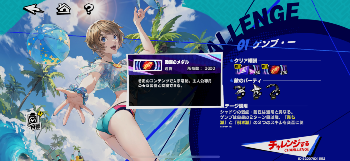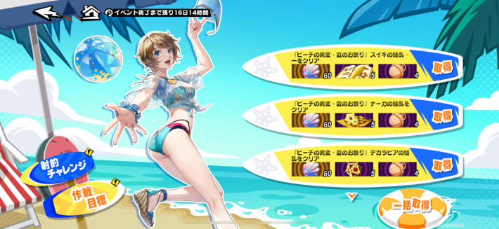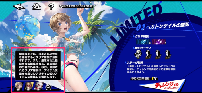 「怪盗トライアル(ビーチの異変)」では、ミッションクリアを目指すノーマルモードと自由な編成で挑むチャレンジボスバトル、毎日1回挑戦可能で育成素材が入手できるクエストの3種類のコンテンツを遊ぶことができます。