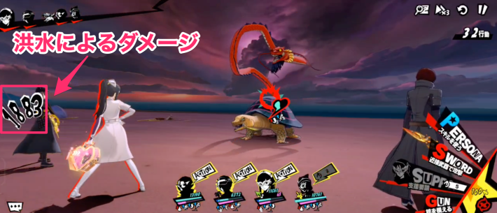 ゲンブ戦ではボスが満ち潮使用時に1つ、引き潮使用時に2つとデカラビアが生きている時はさらに3つ、怪盗全員に「洪水」を付与します。洪水は行動後に最大HPに応じた割合ダメージを与える効果で4つまで累積し、3つ以上あると致命的なダメージになるので注意しましょう。