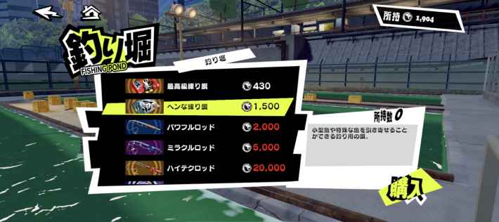 ヌシを釣るには「ヘンな釣り餌」を使いましょう。ヘンな釣り餌はフィッシングポイント1500個で1つ交換できます。