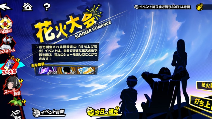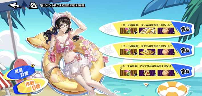 作戦目標で指定された内容をクリアすることでイベント限定の交換用アイテムやキャラと打ち上げ花火を見るのに使う「花火」の制作素材を獲得できます。交換用のアイテムはプラチナミリコインなどと交換できるので期間内にできるだけ報酬を取り切りましょう。