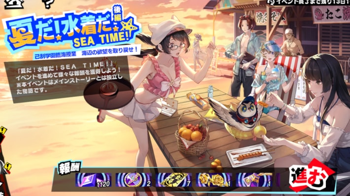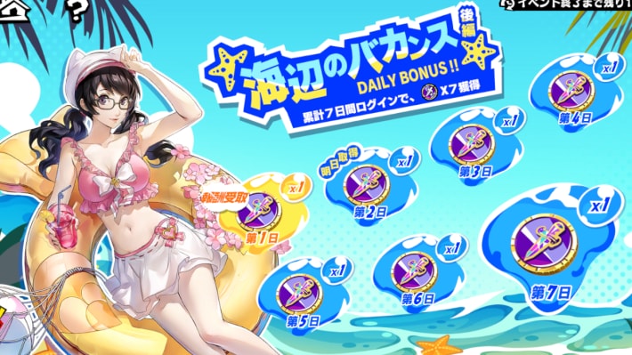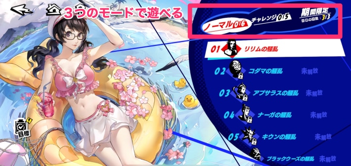 「怪盗トライアル(水着朋子)」では、ミッションクリアを目指すノーマルモードと自由な編成で挑むチャレンジボスバトル、毎日3回挑戦可能で育成素材が入手できるクエストの3種類のコンテンツを遊ぶことができます。