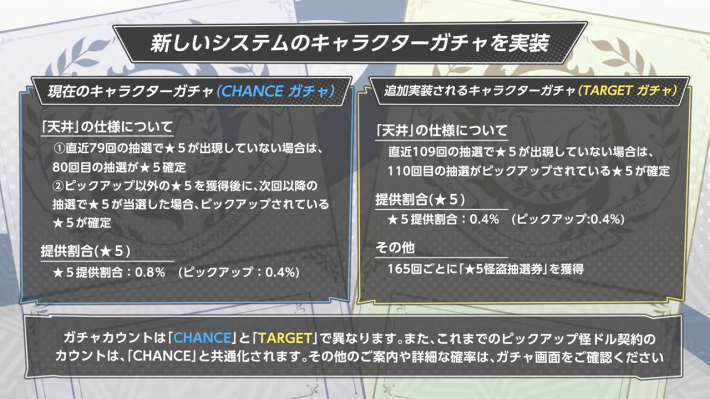 TARGETガチャを165連すると「★5怪盗抽選券01」を入手できます。★5怪盗抽選券は使用することで対象の★5キャラからランダムで1人獲得することができるアイテムです。また、今後恒常ガチャにキャラが追加された際は、★5怪盗抽選券02が入手できる予定です。