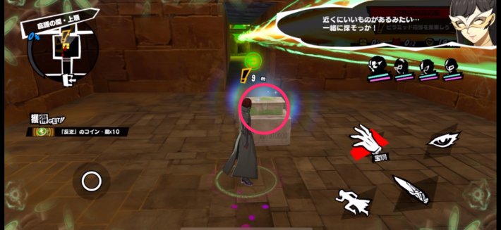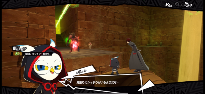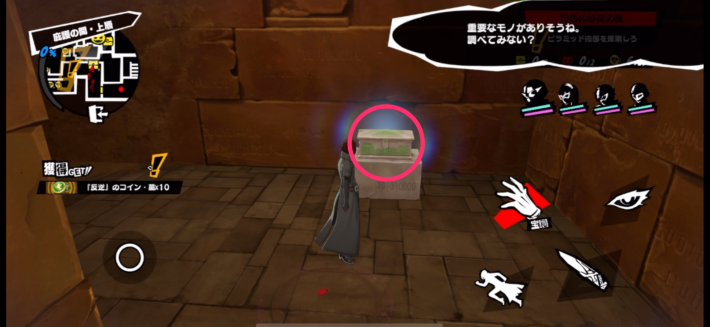 光っている床に1つだけ残っているコインを目印にして、2つ目の宝箱を回収しにいきましょう。コインの奥にある通路に進むと1体目の強敵シャドウが宝箱の前にいるので、倒すことで宝箱を獲得できます。