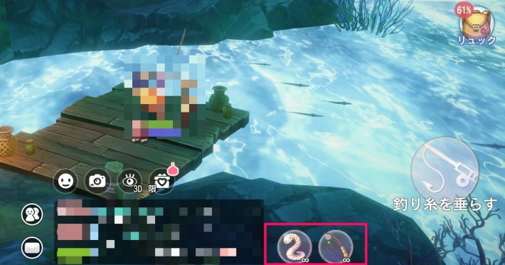 自動で釣りを行いたい場合や特定の魚類を狙う場合は、釣り竿を垂らす前に左下からアイテムを変更しましょう。