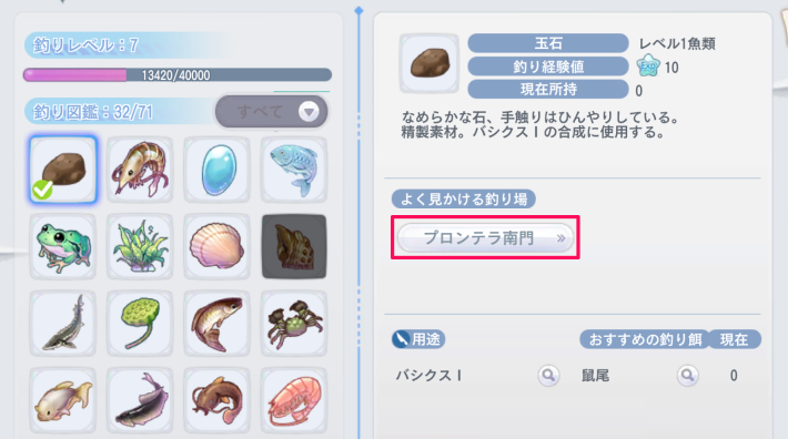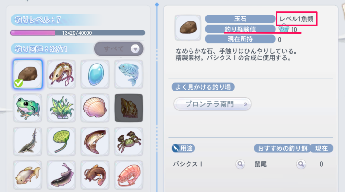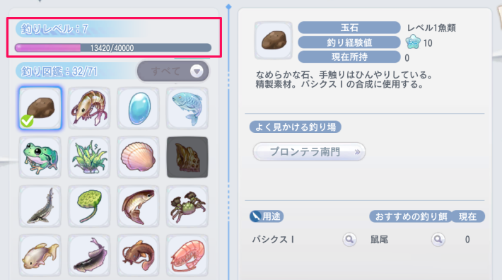釣りはアイテムを獲得するごとに経験値が入ります。経験値は一律で10のため、釣りたいアイテムを繰り返し釣って釣りレベルを上げましょう。