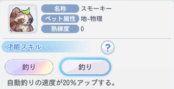 ペットのスモーキーがいると自動釣りの速度が20~40%アップします。また生活特性の真面目を付与・レベルアップすることでさらに速度が上がります。