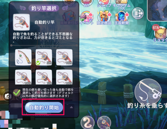 釣り糸を垂らす前に釣り竿を自動釣り竿に変更し、自動釣り開始を押すと、壊れるまで自動で釣りをしてくれます。