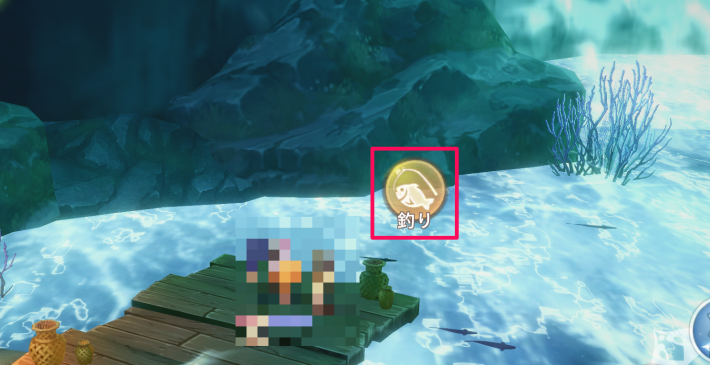 釣り場に着いたら「釣り」が表示されるので、タップする事で釣り状態に入ります。その後に表示される「釣り竿を垂らす」がをタップする事で釣りが始まります。