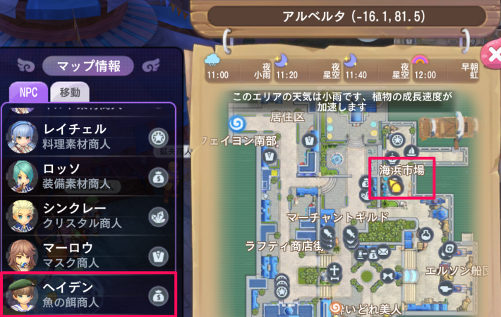 狙いたいアイテムは、対応する餌を使用することで獲得の確率がアップします。アルベルタの魚の餌商人から購入しましょう。