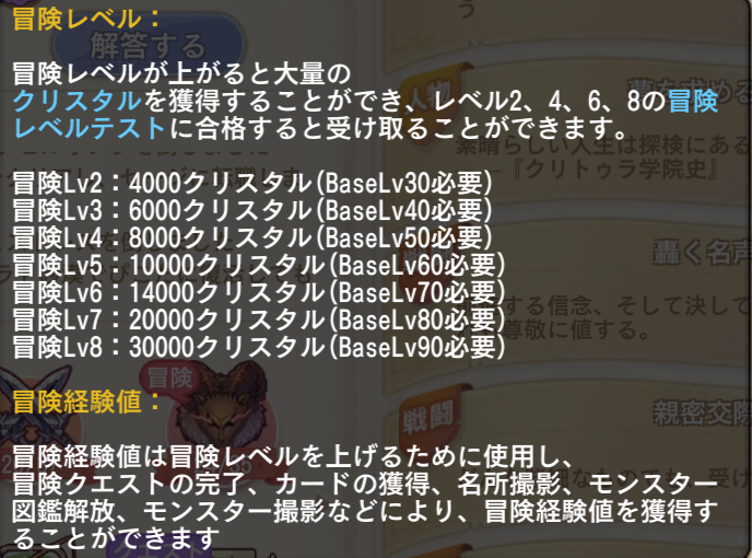 冒険Lvの上げ方 | 学院手帳の実績クリア/カードの獲得/ モンスターの記念撮影/ モンスターの初撃破 |