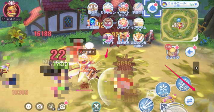 ミストレスが大きく飛び上がるとフィールドに蜂の巣が現れ、ホーネットの群れが出現します。1体1体は強くないものの、群れで攻撃を受けると痛いので先に倒してしまいましょう。