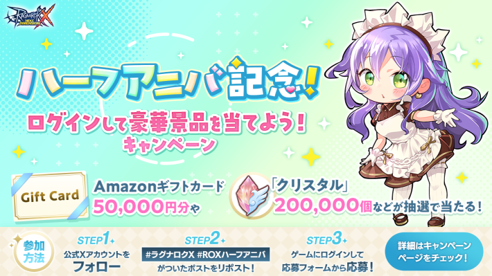 ハーフアニバーサリーイベント開催を記念して、Amazonギフトカード50,000円分や「クリスタル」が抽選で当たるキャンペーンを実施しています。Xのリポストとゲームにログインしてキャンペーンに応募しましょう。