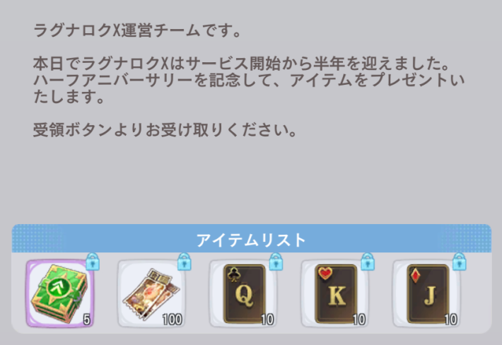 ラグナロクXは5/20(火)にハーフアニバーサリーを迎え、記念として経験の書とイベントで使えるアイテムが配布されました。ゲーム内メールから確認できるので、忘れずに受け取りましょう。