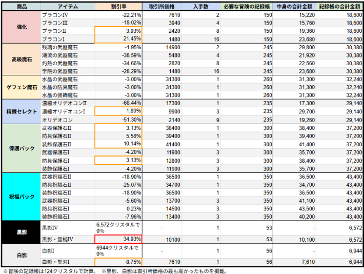 | Point! | 黒影Ⅳは6,600クリスタル以上、白影Ⅰは7,000クリスタル以上で取引されているなら積極的に交換しましょう。 |