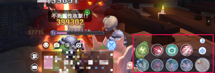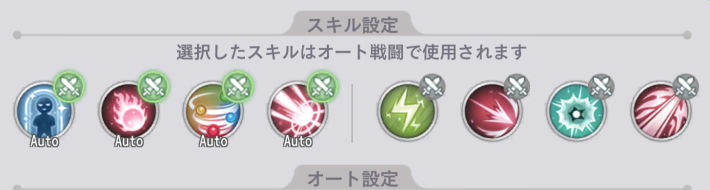 相手の属性と同じ属性スキルはダメージが大幅に軽減されてしまいます。相手の属性以外のスキルをオートに設定しましょう。