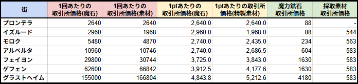 | 1ptあたりの 取引所価格 (魔石) | 1ptあたりの 取引所価格 (精製素材) |