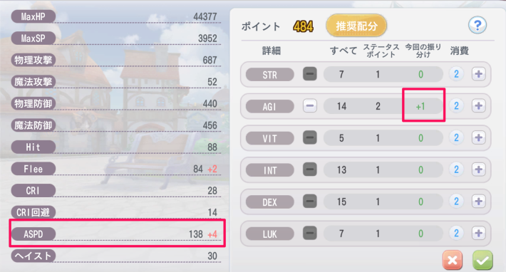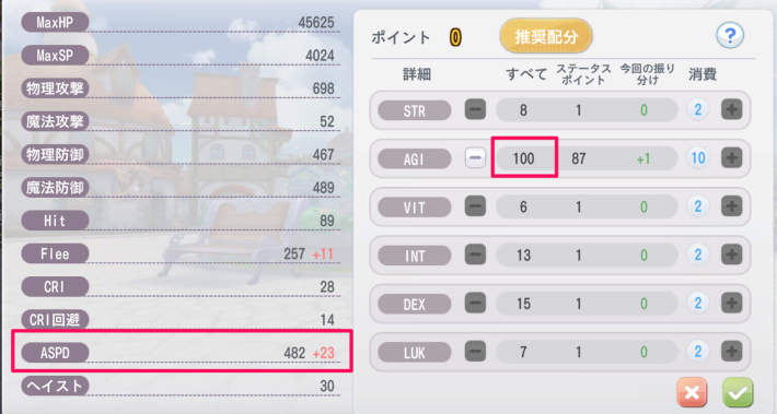 AGI1につきASPDが4上がります。序盤は特にAGIによるASPDの恩恵が大きいので、ステータスやエンチャントで上げていきましょう。また上位2次職以降も、ペットステータスなどでAGIを積むとASPDを確保しやすくなります。