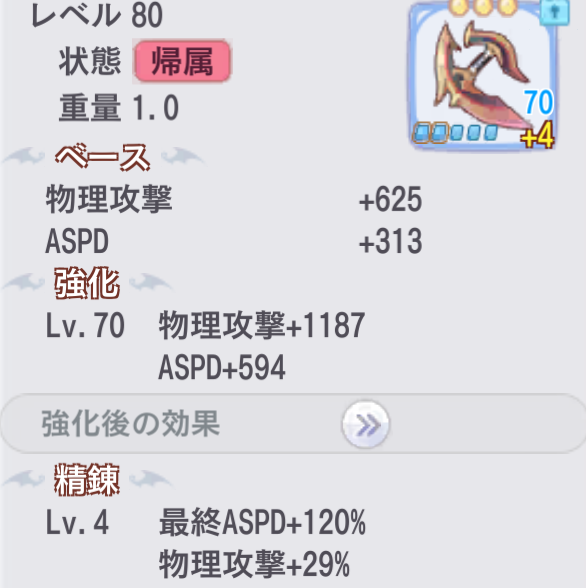 Lv.90頃には精錬・強化・ペット効果などでASPD値が満たせるようにしましょう。ASPDの微調整にタナトスの悲しみカードなどが使いやすいです。強化値はLv.と同等、精錬値はAll+6を目指しましょう。