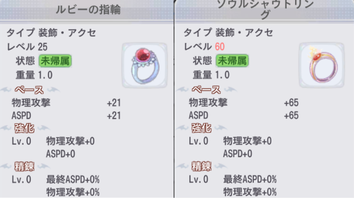 ソウルシャウトリング装飾/アクセ | 【必要レベル】60 【ステータス】 物理攻撃+65 / ASPD+65 【固有効果】 - 【セット効果】 |