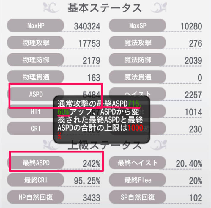 ASPDは通常攻撃の速度に直結するステータスです。ASPDと最終ASPDの値が高いほど通常攻撃が素早くなり、手数が多くなります。