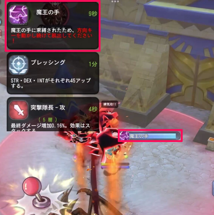 方向キーを動かし続けることで、魔王の手から逃れられます。画面上の方向キーの上で指を素早く滑らせることがコツです。