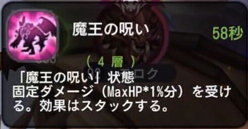 魔王の呪いは効果がスタックし、効果中はMaxHP1%分の固定ダメージを受けます。ヘルトルネードの被ダメージも含めて厄介なため、付与されたら離れて解除を待ちましょう。