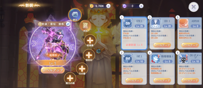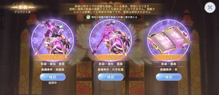 すべての影装レベルが共通化され、碑文と木札も後述のスキル番号ごとにレベルが共通化されます。未開放の影装は解放後にレベルが参照され、複数の影装を強化していた場合はレベルの低い方の素材が一部返却されます。